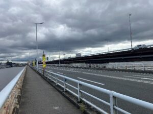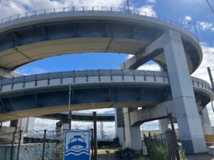 続けていくつかの橋を通過し、ようやく一つ目のターニングポイント、新伝法大橋に到着です。